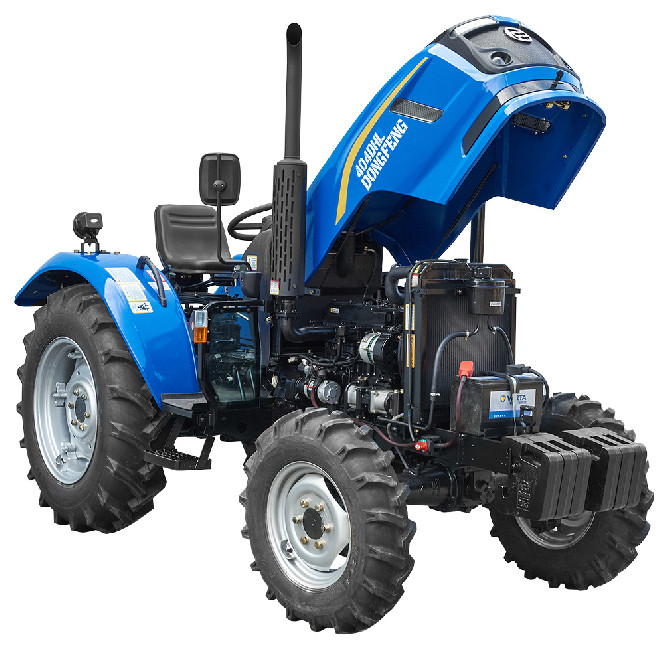 Універсальний повноприводний трактор потужністю 40 к.с. в розширеній комплектації. Забезпечує виконання повного циклу сільгоспробіт, включаючи оранку і передпосівну обробку ґрунту, на полях площею до 20 га. Конструкція, оснащення і комплектація трактора аналогічні моделі 404DHL.Конструктивні особливості:Новий, сучасний дизайн.Надійний 4-циліндровий двигун 40 к.с.Більш потужна коробка передач 8 + 2.2-дискове зчеплення.Гідропідсилювач рульового управління, з окркмим бачком і гідравлічним насосом.Передній ведучий міст.2-швидкісний ВВП 540 / 1000 об / хв.Регульована передня і задня колії.Широкі колеса 7.50-16 / 12.4-24.Роздільні гальма задніх коліс.Стоянкове гальмо.Ручний газ.Блокування диференціала заднього моста.Амортизатор для легкого і зручного піднімання капота.Удосконалення стоянкове гальмо.Комплектація: Покажчик тиску масла, покажчик температури охолоджуючої рідини, амперметр, лічильник мотогодин, покажчик рівня палива.Гідравлічний вихід.Задня додаткова фара.Передні навісні вантажі 6х20 кг.Зчіпний пристрій для причепа.Комфортне регульоване сидіння з амортизатором.Електрична розетка для причепа.Дзеркала заднього виду.На крилах встановлені повторювачі покажчиків поворотів та габаритів.Сигнал аварійної зупинки.Гумовий килимок.Купити трактор Dongfeng 404DHL можна по всій території України через наших офіційних представників, або замовити через спеціальну форму зворотнього зв’язку в розділі "Контакти". На всі трактори Dongfeng дається гарантійний строк експлуатації 2 роки.
