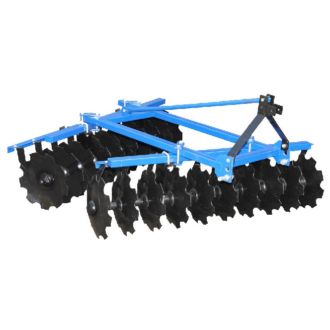 Борона дискова навісна призначена для безвідвальної суцільної обробки ґрунту на невелику глибину. Дискова борона вішається на триточковий навісний механізм позаду трактора.Дискове боронування передує оранці. Проводиться з метою перебивання рослинних решток, розпушування ґрунту, збереження вологи, загортання в ґрунт пожнивних залишків, шкідників і збуджувачів хвороб культурних рослин, насіння бур’янів для провокації їх до проростання. Подальшою оранкою бур’яни, що проросли, загортаються на велику глибину та гинуть. Дискове боронування суттєво знижує витрати механічної енергії на оранку, що, відповідно, значно економить витрату палива при подальшій оранці.Перевагами дискових борін нашого виробництва є:проста та надійна конструкція;збільшена вага;збільшена товщина профільної труби;покращене фарбування;покращене зварювання.